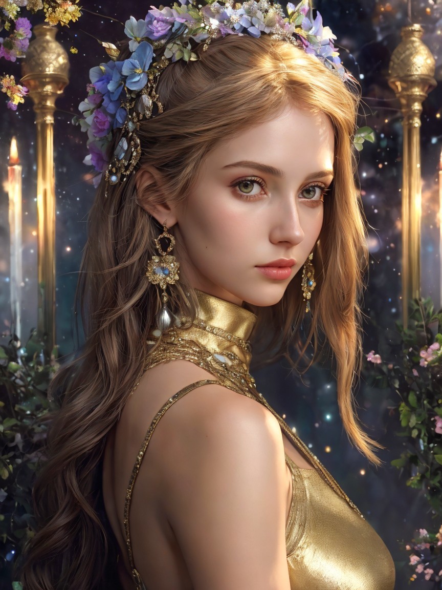 The image showcases a young woman with long, wavy hair adorned with flowers. She wears a shimmering golden dress, exuding elegance and beauty, framed by an enchanting floral backdrop.