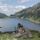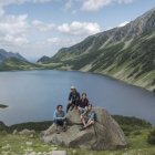 Four hikers pose on a boulder overlooking a serene lake surrounded by lush greenery and majestic mountains under a partly cloudy sky, encapsulating a perfect day in nature.