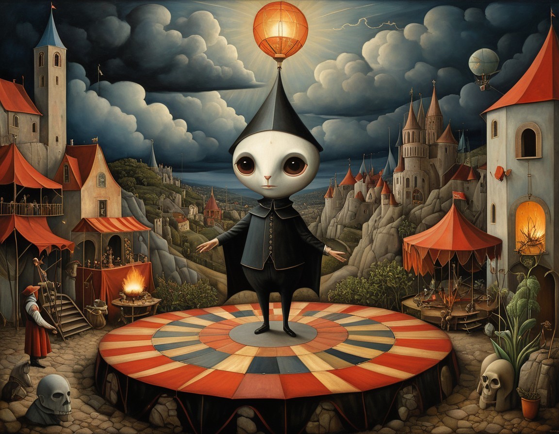 A whimsical figure stands on a colorful stage, surrounded by a magical village. Dark clouds loom above, contrasting with the playful atmosphere created by bright tents and lights.