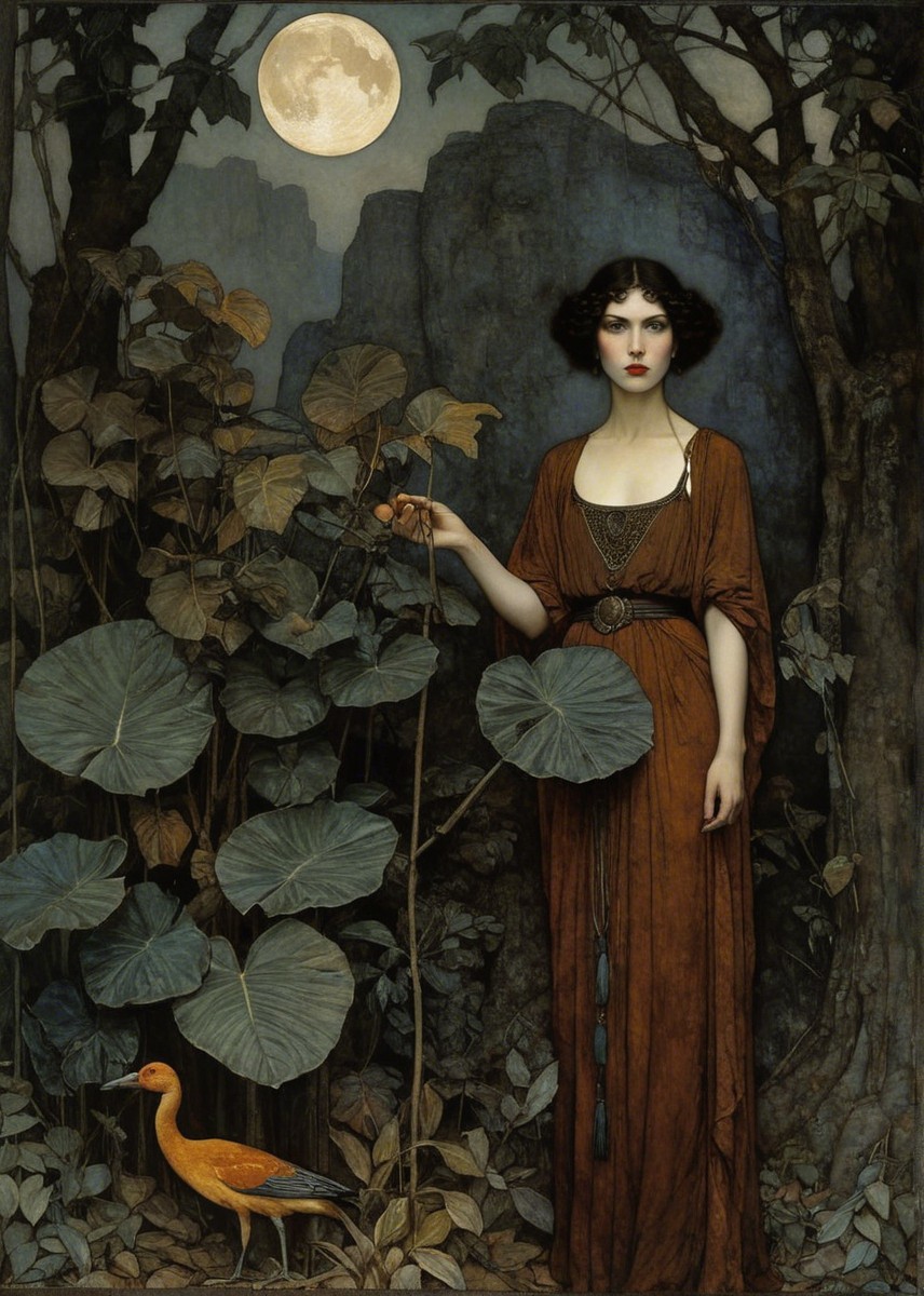 A serene woman stands in a lush, twilight forest, dressed in a flowing brown gown. A moonlit stream cascades nearby, enhancing the enchanting atmosphere of nature and mystery.
