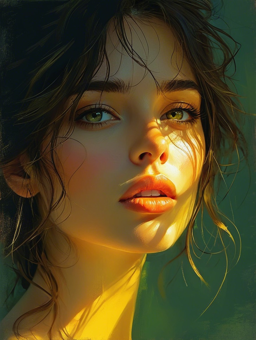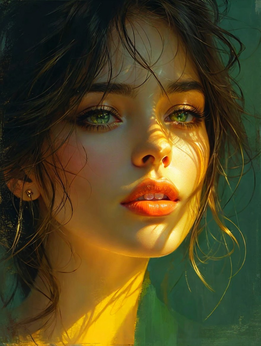 A close-up portrait of a young woman with captivating green eyes and soft features. Her hair is tousled, and warm light creates a gentle glow on her face, enhancing the ethereal mood.