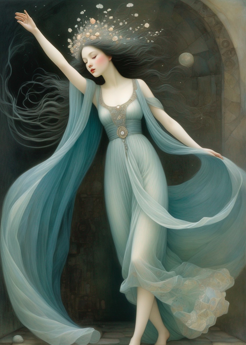 Ethereal figure in flowing blue garments with dandelion headdress in forest