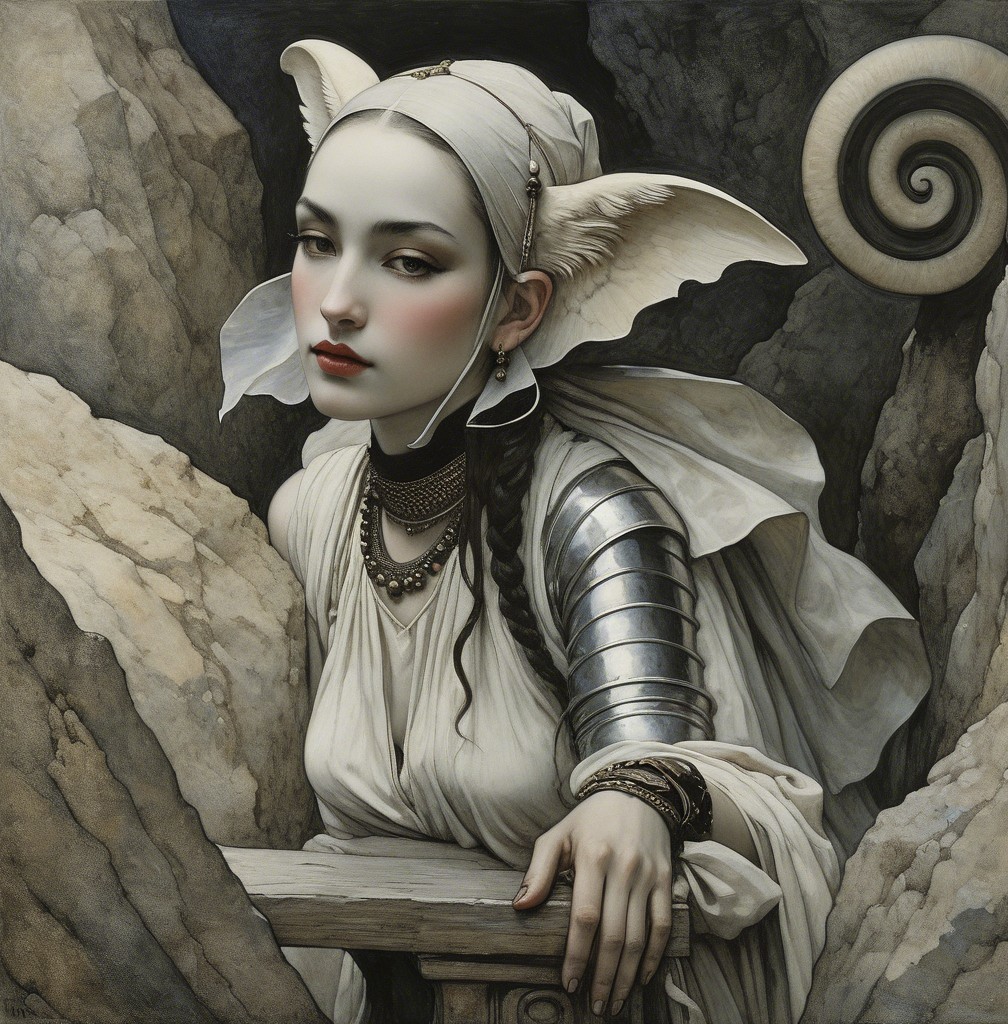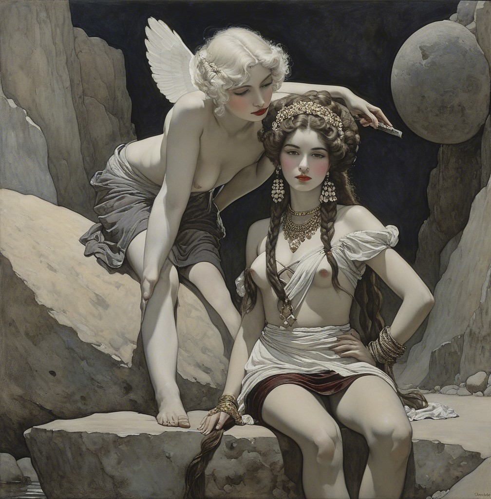 The image depicts two elegantly dressed women with contrasting hairstyles, seated on rocky terrain. They share an intimate moment against a dramatic, moody backdrop, evoking a sense of mystery and connection.