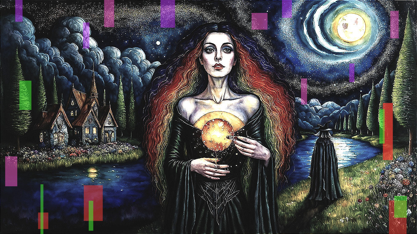 A mystical scene featuring a woman with vibrant, flowing hair, holding a crystal ball. Behind her, a serene landscape with a lake, a house, and a figure in a cloak, all under a cosmic sky.