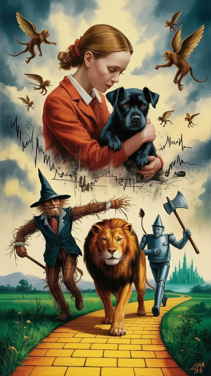 The image features a girl hugging a black puppy, framed by fantastical elements like flying creatures and iconic characters alongside a yellow brick road leading to a magical city.