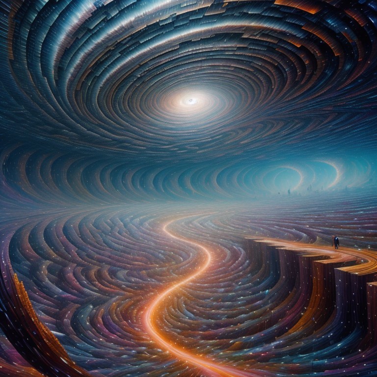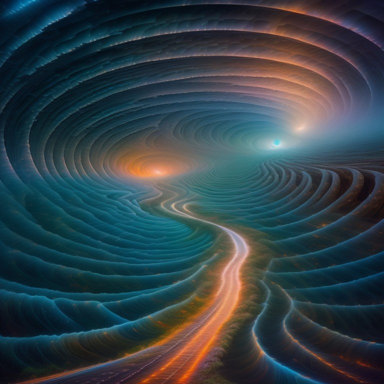 A vibrant digital artwork featuring surreal, undulating landscapes with vivid colors, flowing rivers, and a fantastical, luminous sky.
