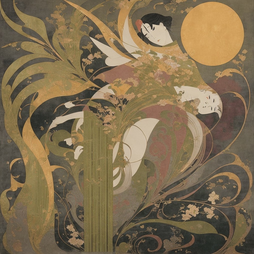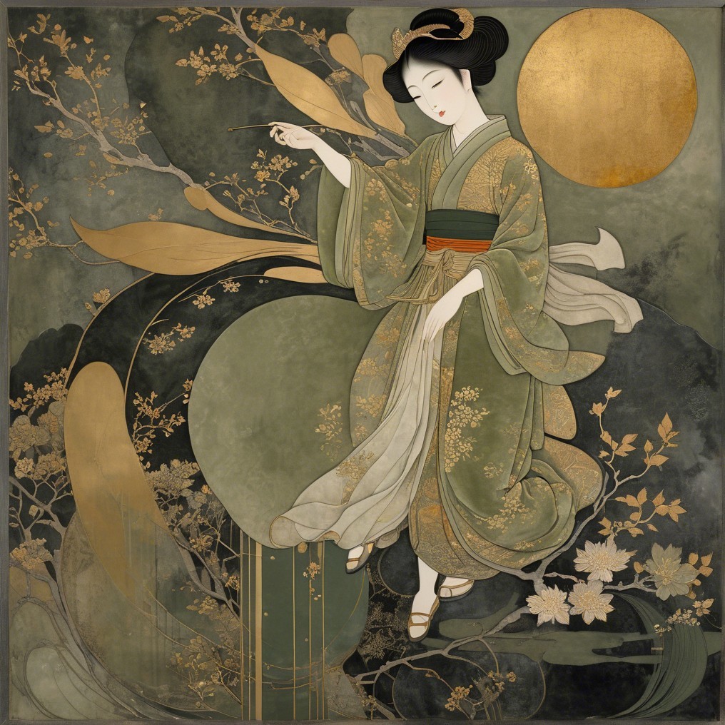 Legend of the Girl and the genie, Medieval Japanese Artists Sumi-e Style, Velvet blush olive green, sage, Shabby, Dull Gold, Amber Gray, marbled. dramatic