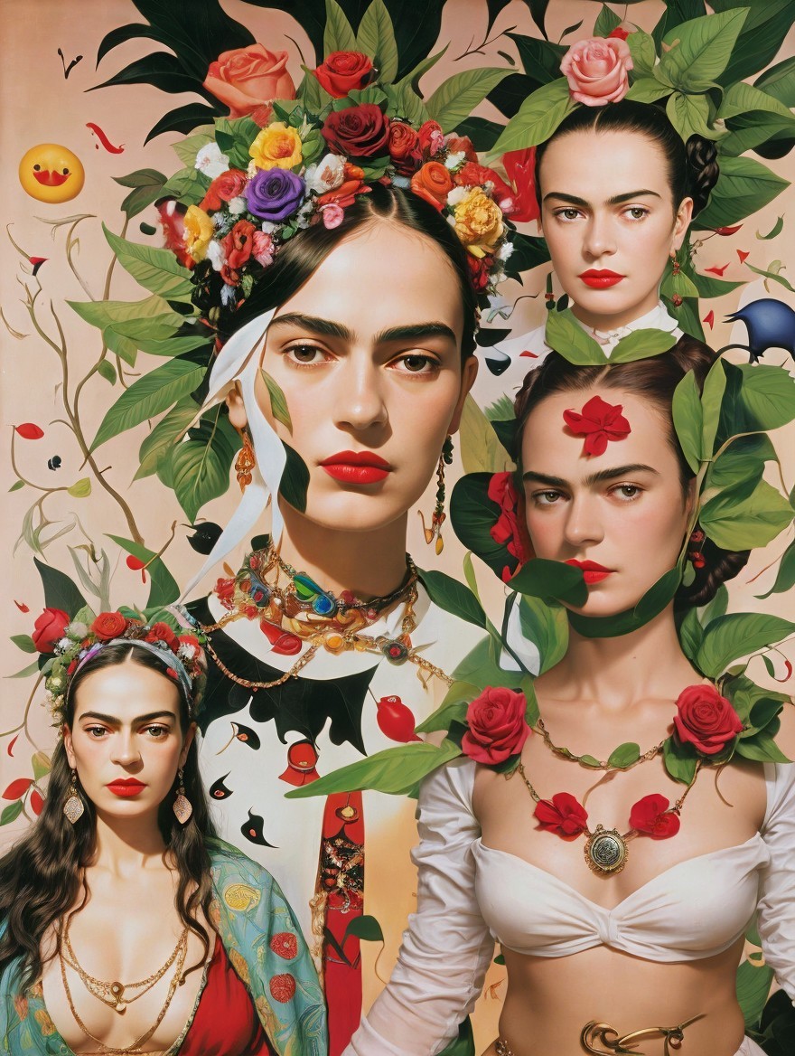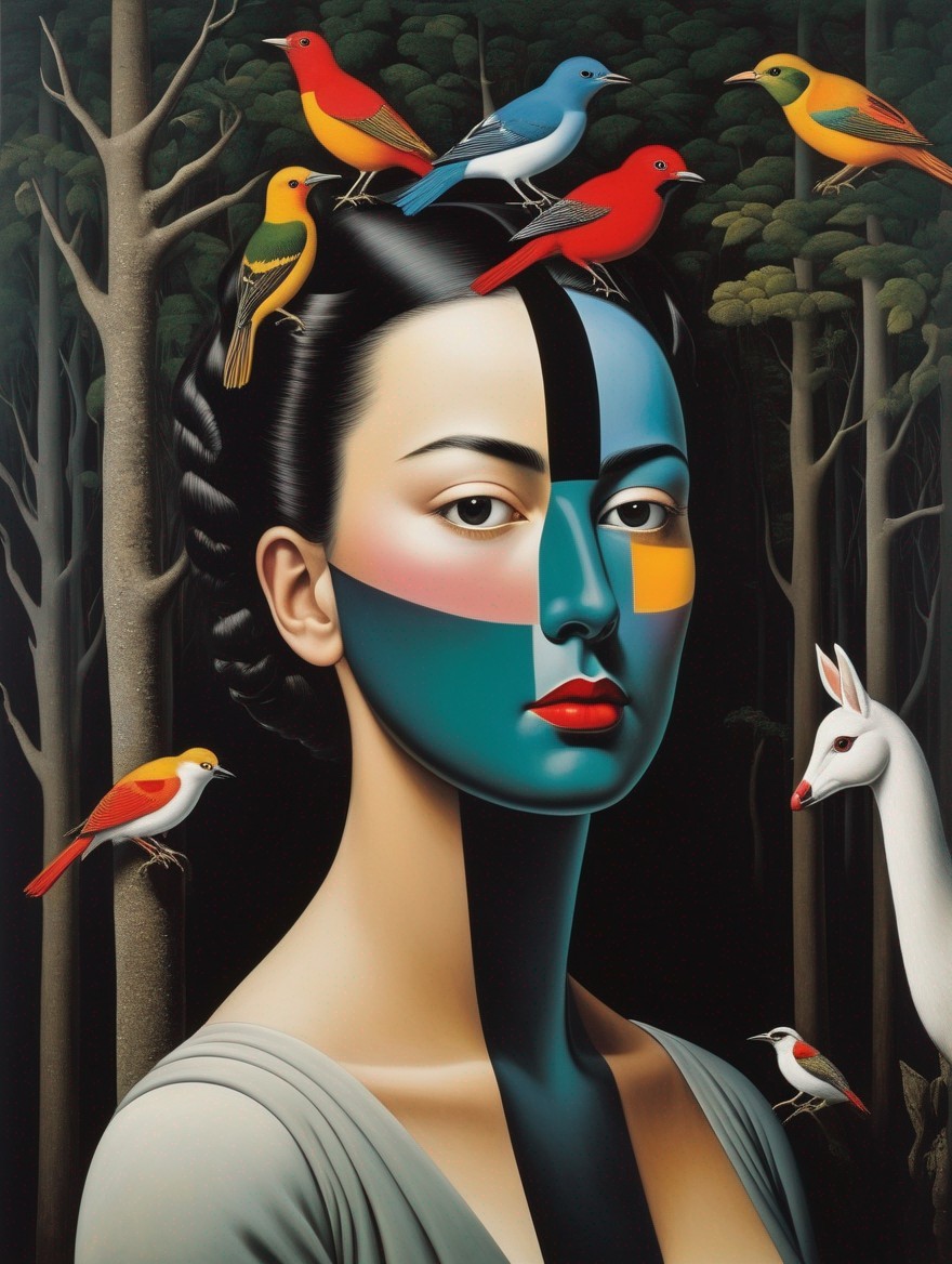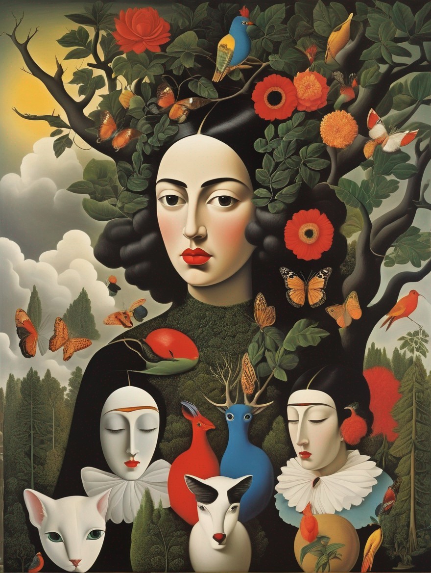 An illustration of a woman with a blue headwrap, golden jewelry, against a lush forest backdrop.