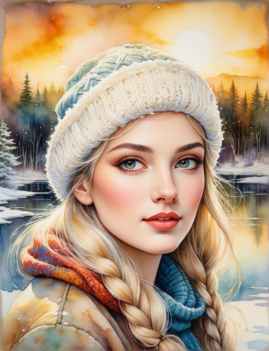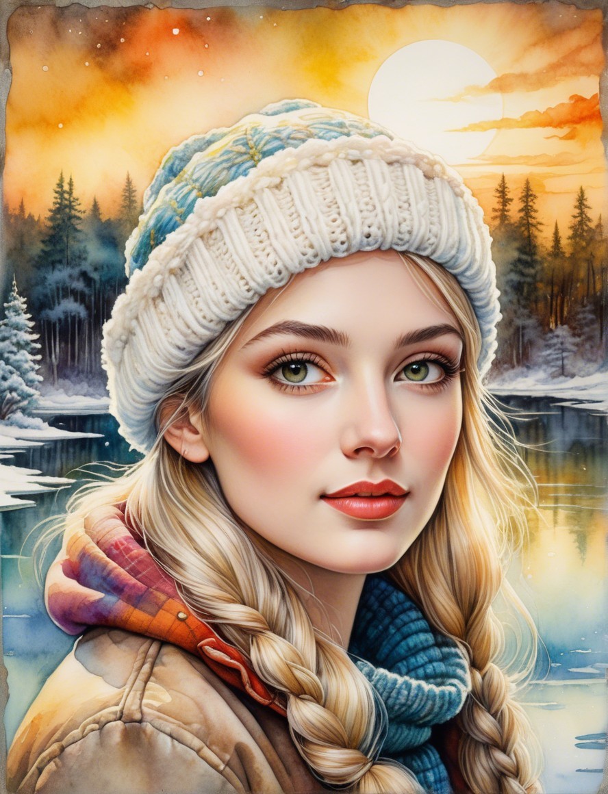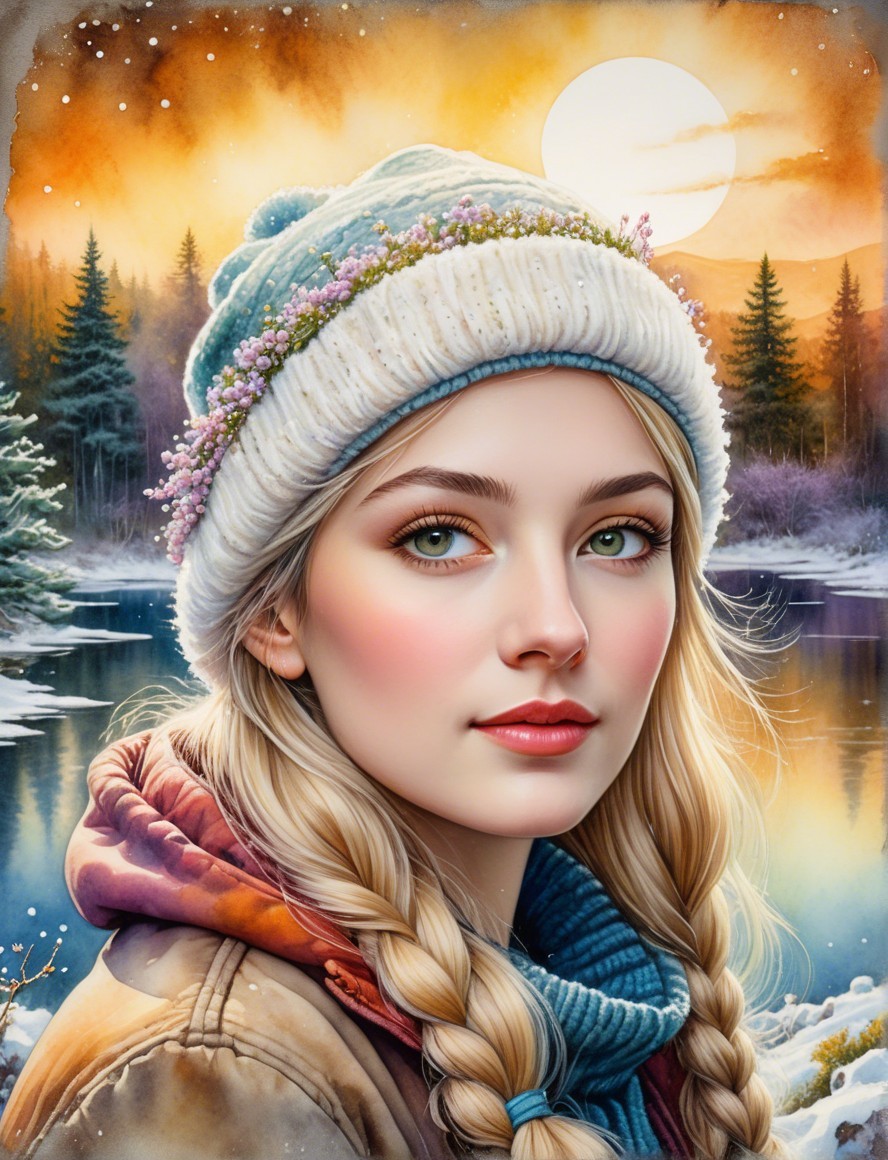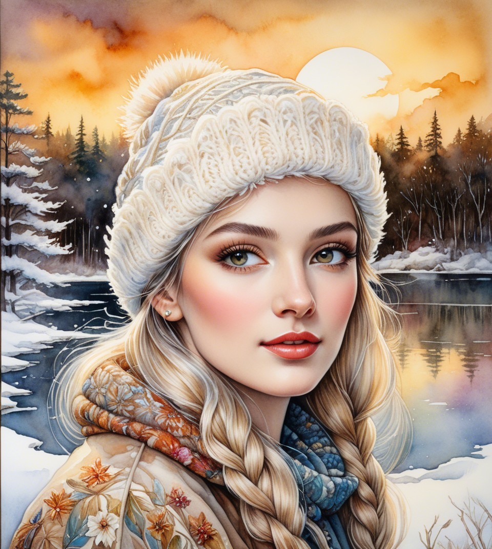 + Prompt:Create a detailed watercolour and ink portrait in the style of Josephine Wall, Overton Loyd, Dariusz Zawadzki, Stan lee and Edward Emshwiller of an enchanting female standing confidently in a winterly forestal background with a lake, Stylized depiction. Serene expression, delicate makeup. Her skin tone is a beige medium shade, highlighting her youthful appearance. She wears a white beanie. Reminiscent of woodcut-inspired graphics, fauvistic fractalization, divisionism, radiance, cottagegore 1.7, stylization 1.3, Background: nuances, first,detailed reflections on water surface,luminous, soft Casual lineeage 1.8, pastel colors, ambient occlusion 1.5, raytraced shadows 1.8, parallax occlusion 1.2, filmed with Hasselblad 60mm f3.5 Distagon CF, push processing technique, lens flares, triadic color scheme sea-Green, beige,pink, delicate coloring, tesselated headshot, juvenile beauty, textured pointillism details, eroticism, perfect handsface, cel-shaded illustration by Leonora Carrington and Overton Loyd, octane render illustration 1.5, comic book art merged with concept art, mystery essence, muted tones in background, gradient inking colors, precise Gelsculpt 64K, Novelty architecture, 64k rendering, metal paints, geometrical patterns, symmetrical, somber, crisp quality