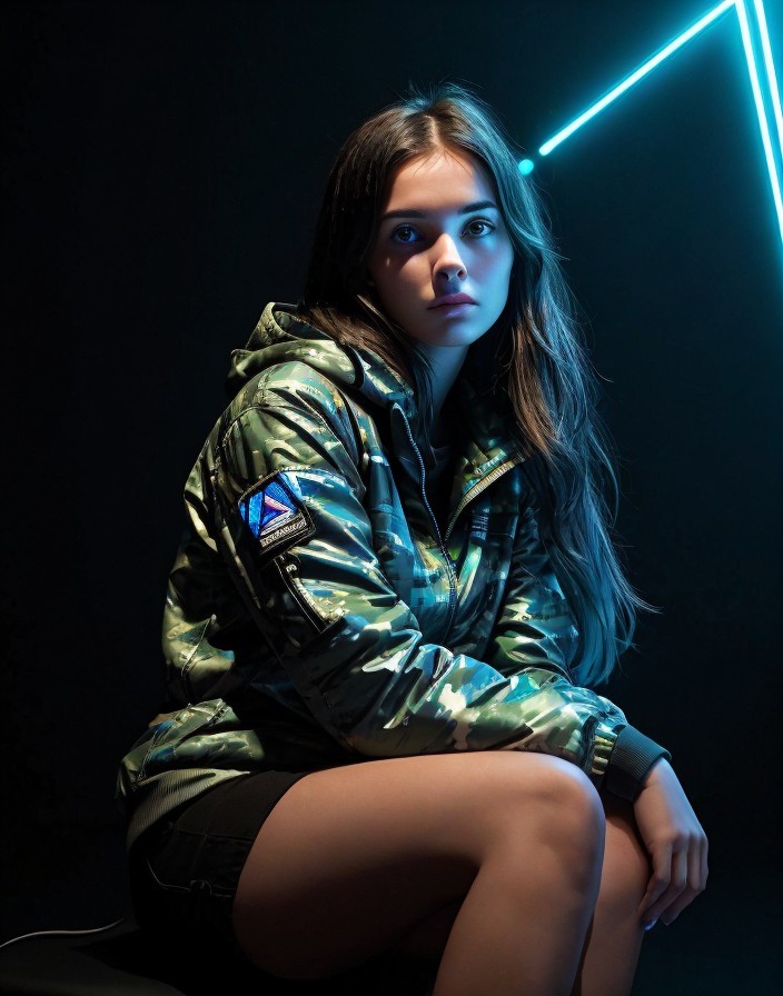 A young woman wearing a camo jacket sits under blue lighting, looking pensively away from the camera.