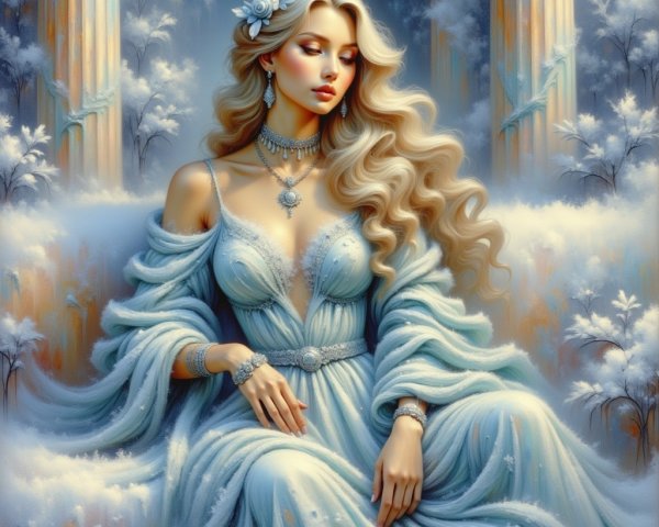 A stunning woman with long, flowing red hair wears a vibrant red dress adorned with intricate floral designs. She gazes confidently at the camera, set against a soft, blurred natural background.