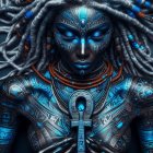 The image features a striking figure with intricate body paint resembling ancient hieroglyphs. Their hair is adorned with colorful beads, and they wear a prominent ankh necklace, exuding a mystical aura.