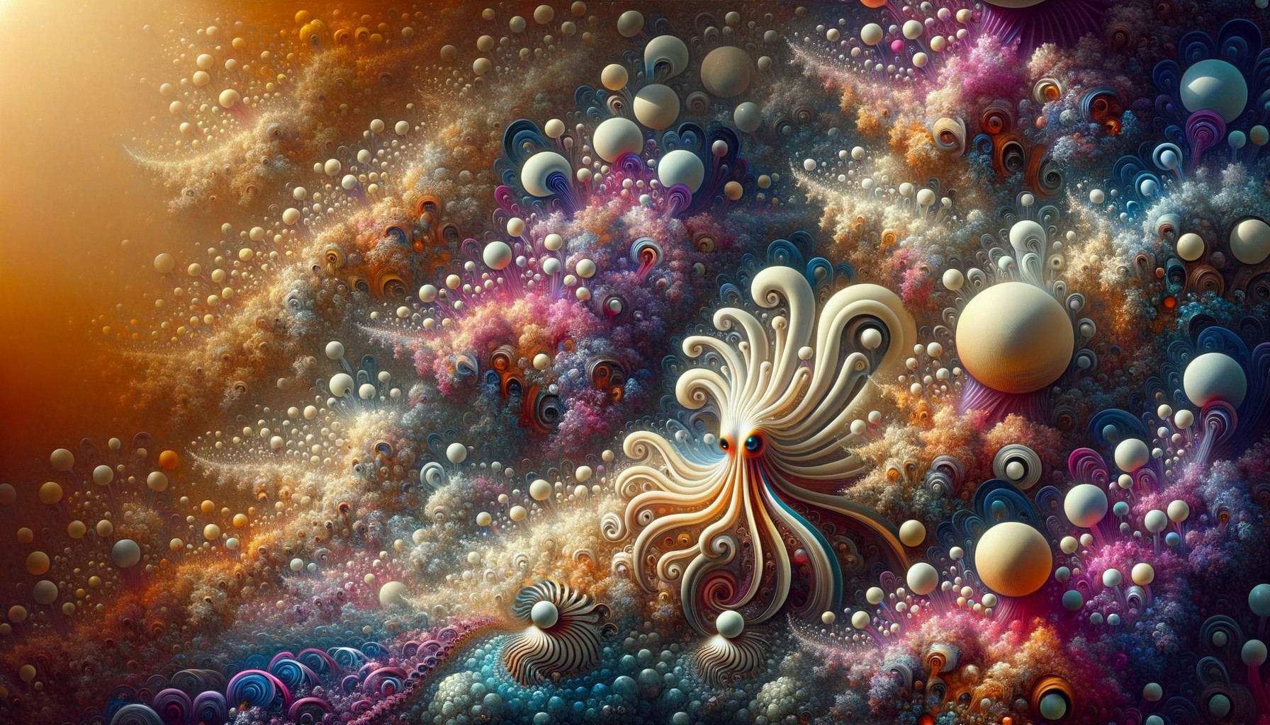 Prompt: (start from a single point and incrementally grow an ebullient organically inorganic creature composed of highly-probable impossibilities predicated on the reality of quantum erasure and unlimited parallel realities) - resulting in covertly depressed lone independent hive (hedonauts jumping in jubilation) - as (a rhythmic wave function of love and ambivalence pours over the particle duality of light lunches on the riviera) - extolling decadently humble origins of sensate numbness creeping upward as (octopi return to their mountainous spawning pools by volcanic suboceanic vents covered in Koch crystalline madness)