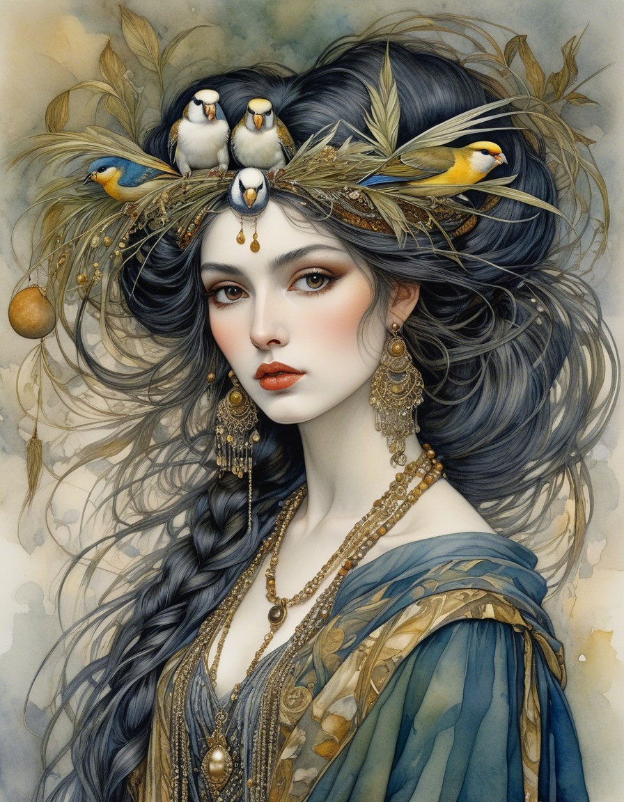 A beautiful woman adorned with intricate jewelry and a flowing blue garment. Her elegant hair is crowned with decorative birds, adding to her ethereal charm and grace. A smaller bird rests on her hand.
