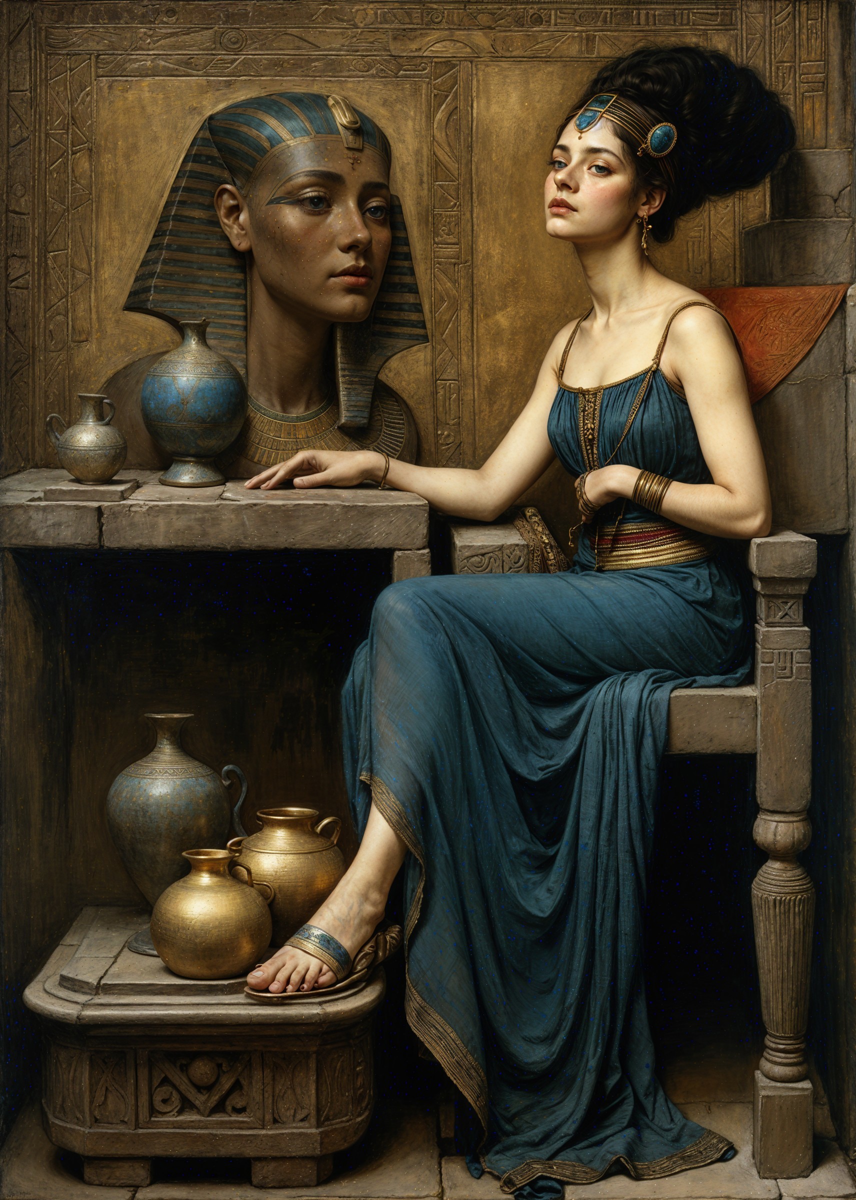 A woman in ancient attire sits beside a pharaoh's bust, surrounded by pottery and fruits. The artwork beautifully blends historical elements with a serene, contemplative atmosphere.