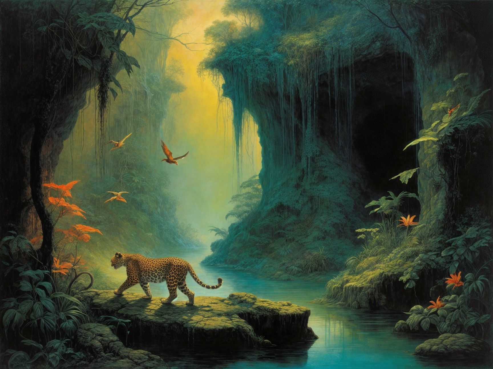 Prompt: "Wet oil painting, by Daniel Merriam and Zdzisław Beksiński, dark subdued palette with small touches of bright color; an ancient grotto, hanging vines, lush jungle with tropical birds in flight and a large clearly defined leopard; mysterious atmosphere, mist and shadow, filtered light in bright patterns, deeply saturated color"