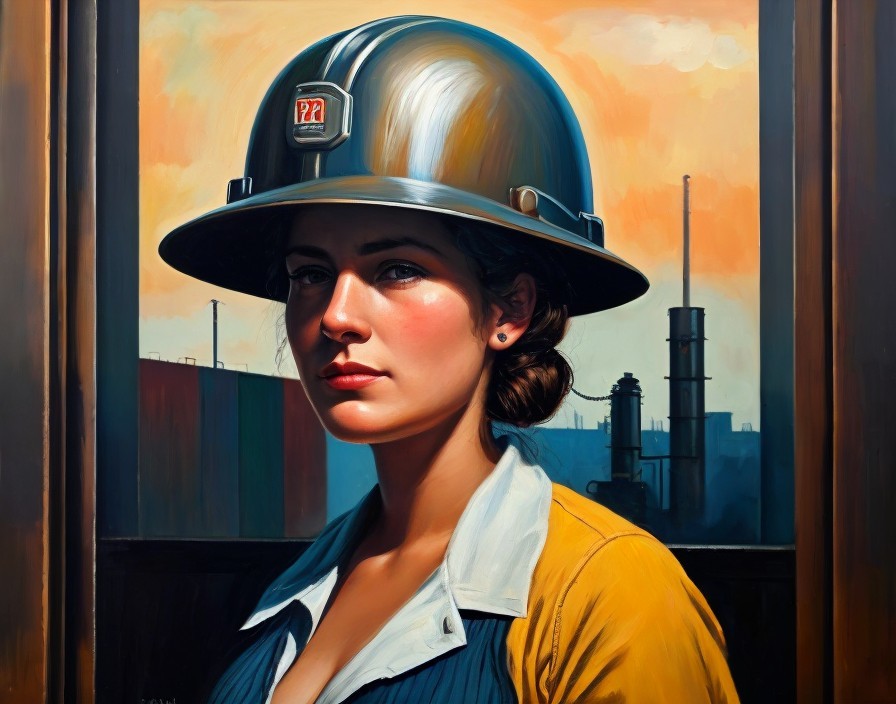 A portrait of a woman in a hard hat with an industrial backdrop, showcasing a confident and strong demeanor.