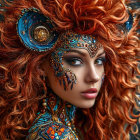 A striking portrait of a woman with vibrant orange hair adorned with colorful flowers. Her face is intricately painted, blending nature and art, evoking a dreamlike, ethereal beauty.