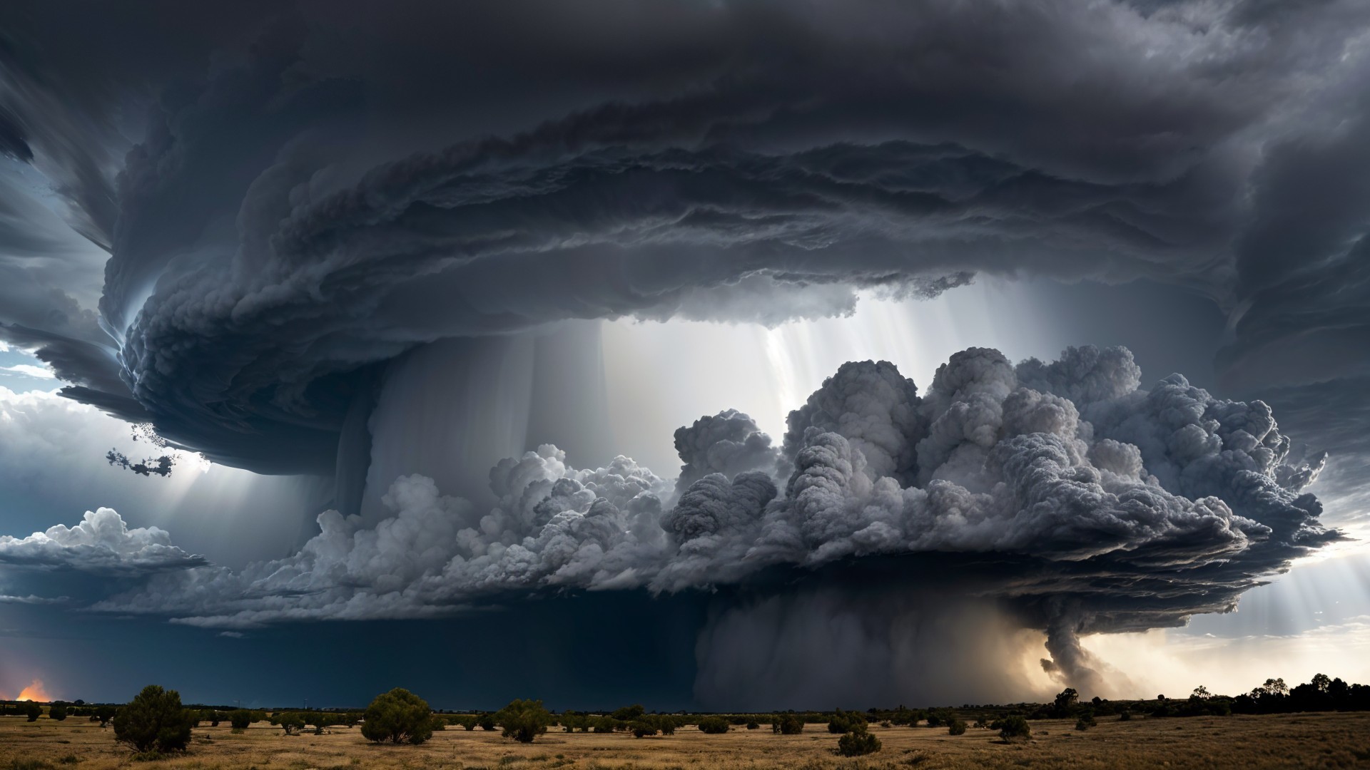 A dramatic sky filled with dark, swirling clouds, illuminated by beams of light breaking through. The scene conveys a powerful sense of nature's intensity, with a vast landscape below.