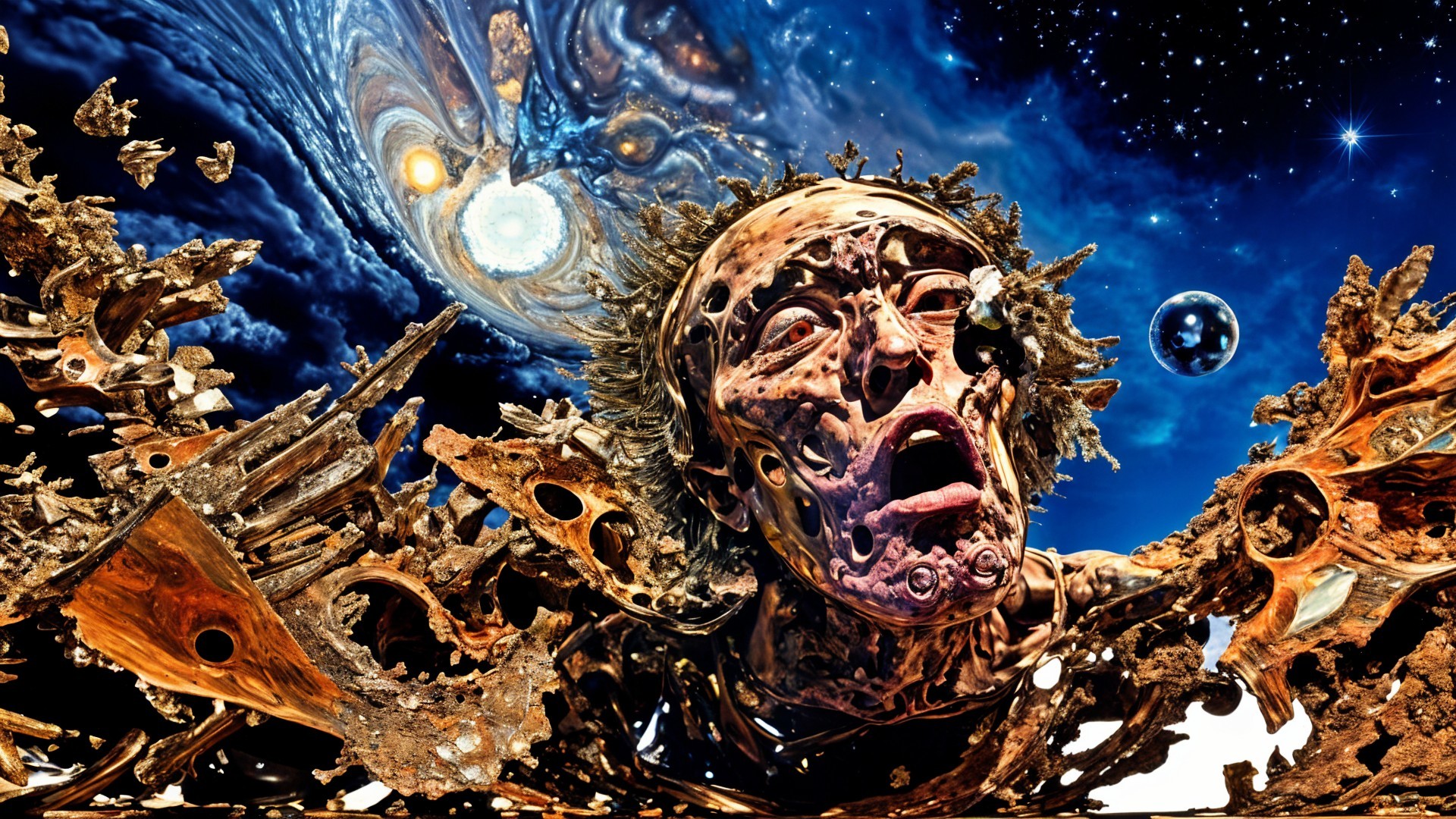 A surreal scene features an expressive, aged man's shocked face against a cosmic backdrop. Two figures emerge, creating an eerie juxtaposition of human emotion and otherworldly elements.