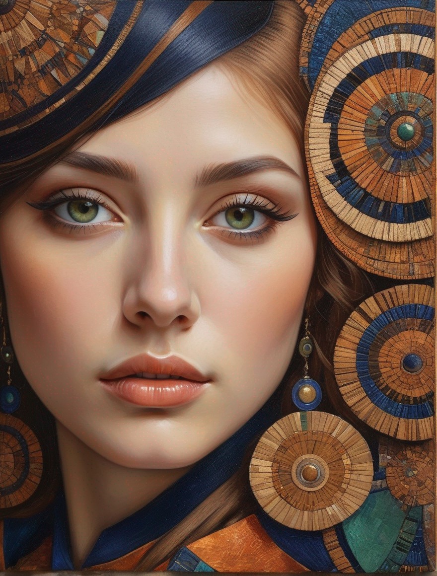 A portrait of a woman with intricate circular patterns in vibrant colors surrounding her face.