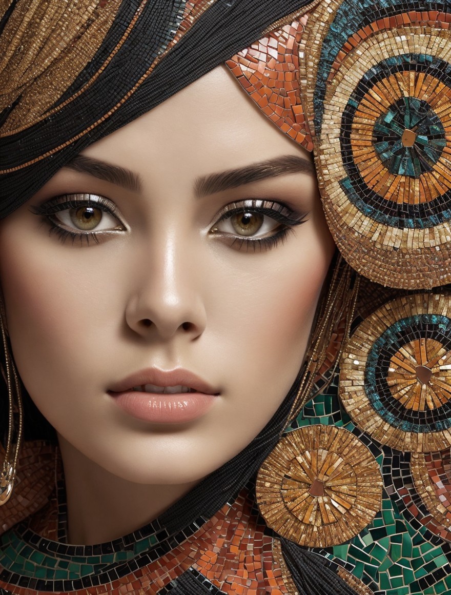 + Prompt:Create a highly stylized and detailed image of a woman's face with a mosaic texture overlay, where the face is oriented frontally, filling the majority of the frame. The face has fair skin with a subtle ivory undertone, which is segmented into small, tessellated, off-white and beige tiles. She has soft, well-defined facial features including almond-shaped chartreuse eyes with dilated pupils and dark, thick eyelashes, a pert nose, and full, gently parted lips with a natural rosy hue.