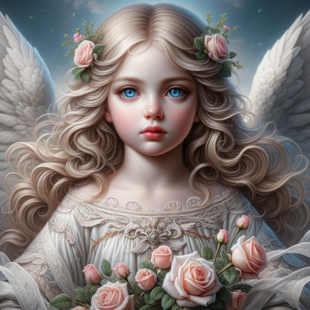 An angelic girl with blue eyes, curly hair adorned with roses, wearing white and holding pink flowers, set against a sky backdrop.