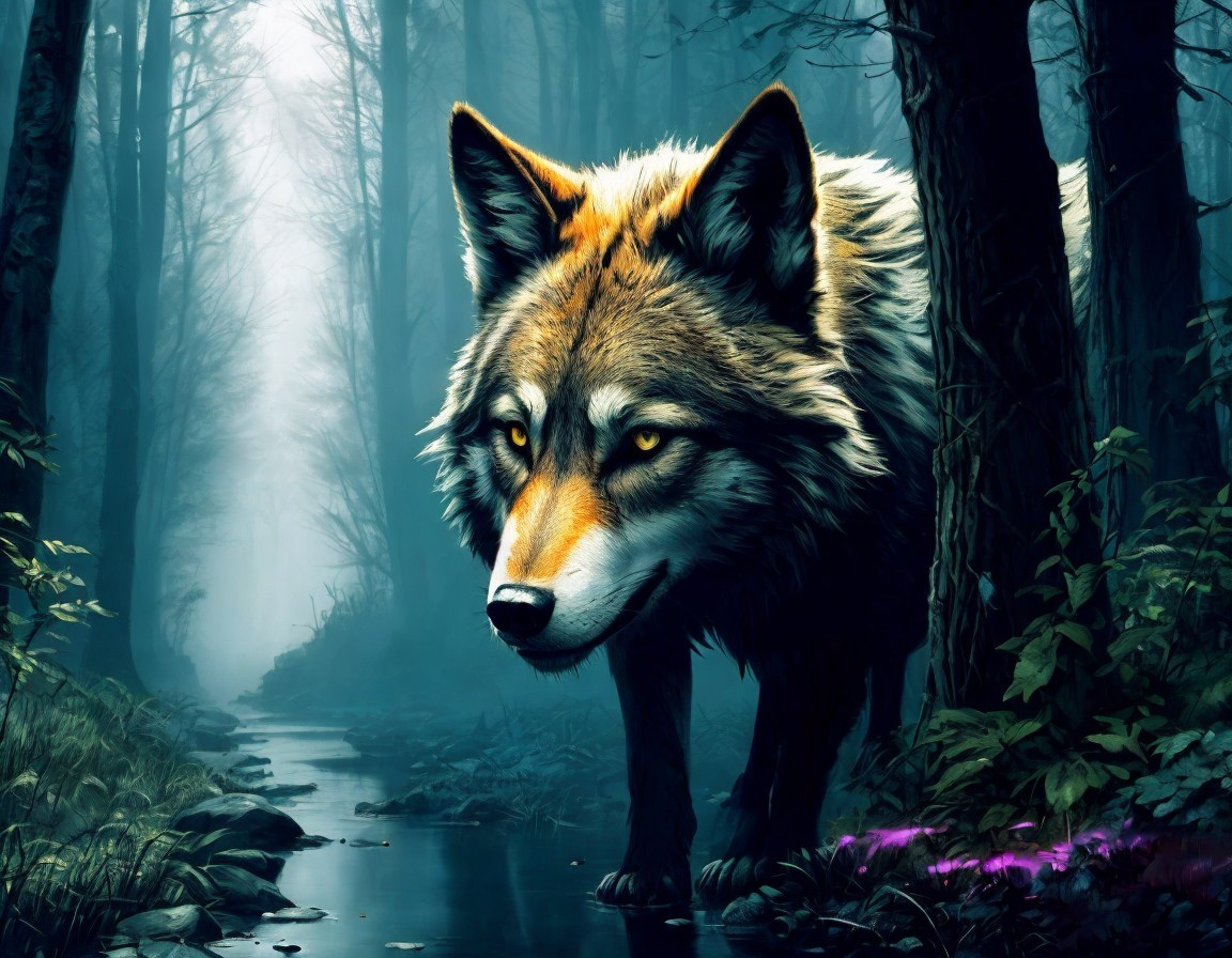 Majestic wolf in misty forest with purple foliage and eerie light orbs