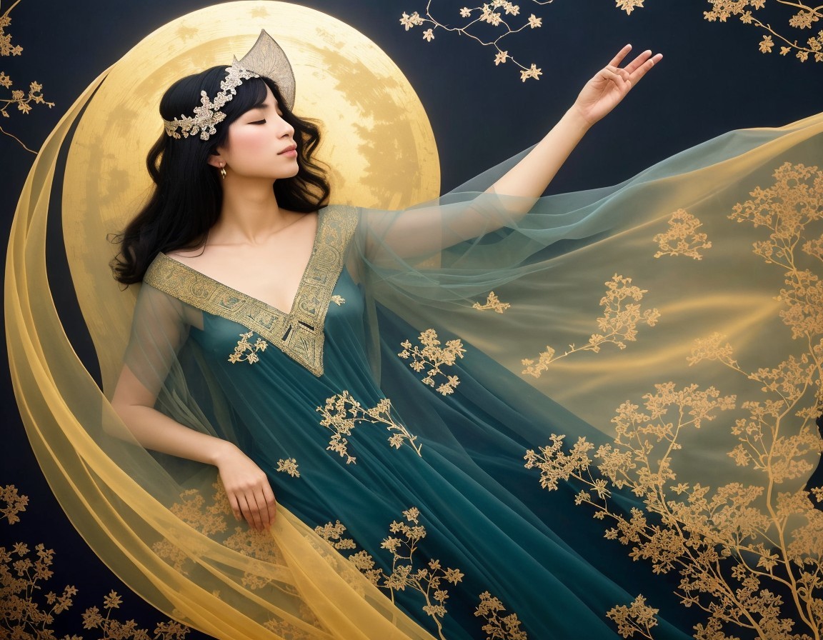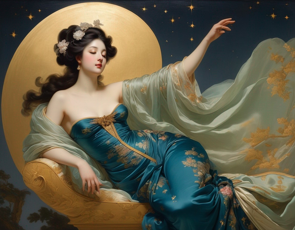 A woman in a flowing dress sits in a golden crescent moon against a night sky with stars and towering cliffs.