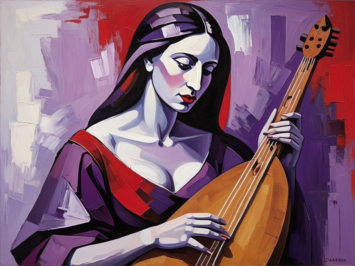 (Try from Ursula) - The painting features a woman with long, dark hair, playing a lute. Her expression is serene, set against a vibrant backdrop of purple and red hues, showcasing a blend of strong colors and emotions.