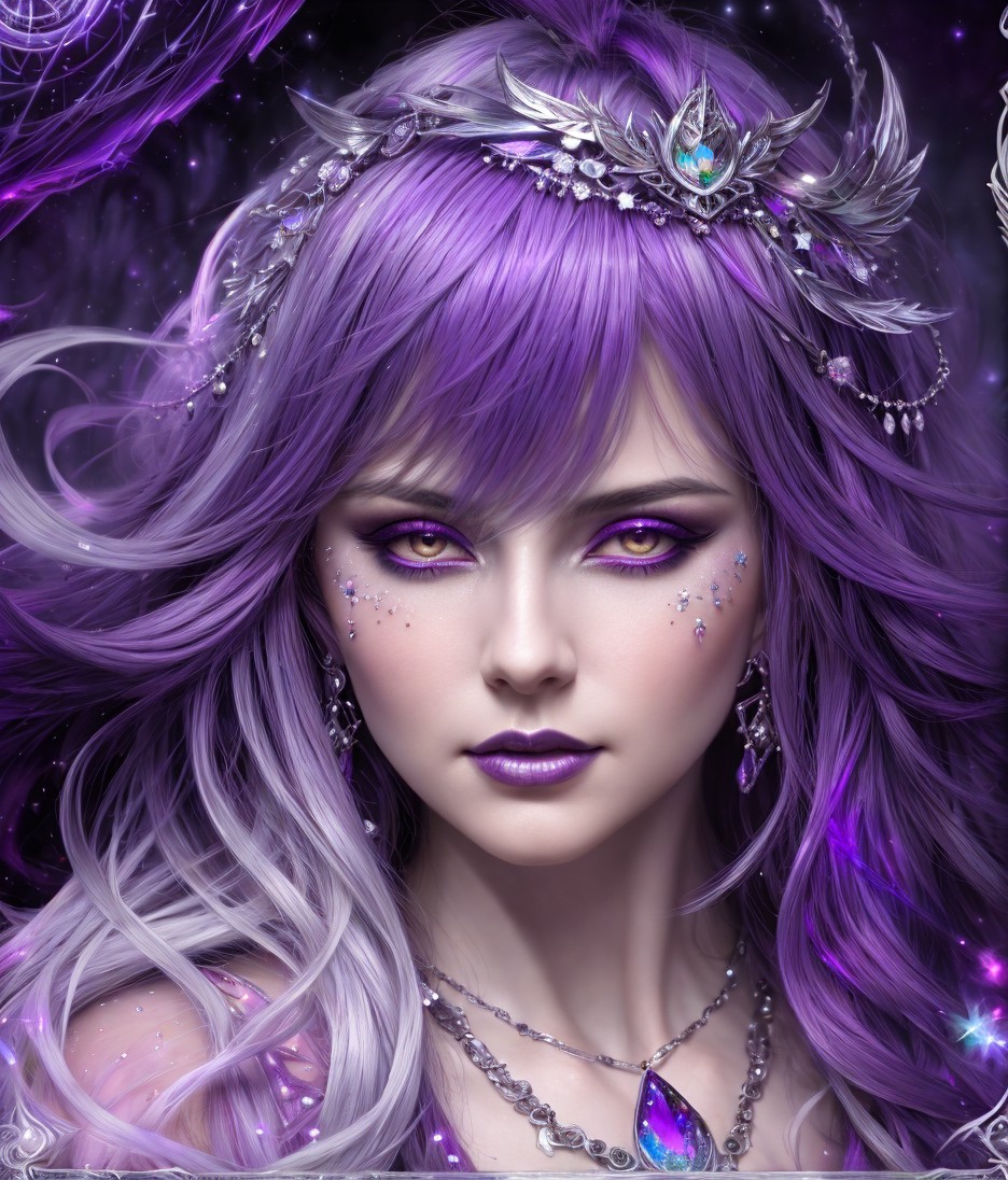 Fantasy depiction, watery ink lithography, female sorceress in silver robe, crystalline, detailed hair, dark fantasy art, charcoal textures, halo, auratic, Intricate face, bright colorful iridescence, auracore,triadic color scheme purple  red white, blended styles of occult dark fantasy and comic book art, detailed ornamental garments, intricate details, dynamic lighting 1.7, hues, chipped background, flares, metallic colors , ambient occlusion1.5, maximalism, ornamental details, iridescence, daguerreotype on old paper, saturated colors in background, psychedelic psychpomp , occult scene, anisotropic filtering 1.8, shadow mapping 1.3, wavery texture patchwork, cottagegore 1.7, 3d effects, echaustic strokes, stylized illustrative style, stylized lineage illustration, brightness 1.4, hues, CyberTech Elements, clockpunk features, spiritual essence, devilish eyes, volumetric plushy colorization 1.7,high coloring 1.9