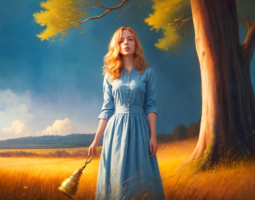 Prompt: "little girl with blond reddish wavy hair in a blue cotton dress is standing on the top of a tall grassy mound, she is ringing a huge golden bell situated up in the blue beautiful sky, landscape mode, forestry, moody trees, mystical surroundings, Vintage abstract realism in an oil painting, muted tones evoking a nostalgic aesthetic"