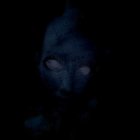 The image features a dark, mysterious figure with glowing blue eyes peering intensely from beneath a shadowy hood, creating an eerie and captivating atmosphere.
