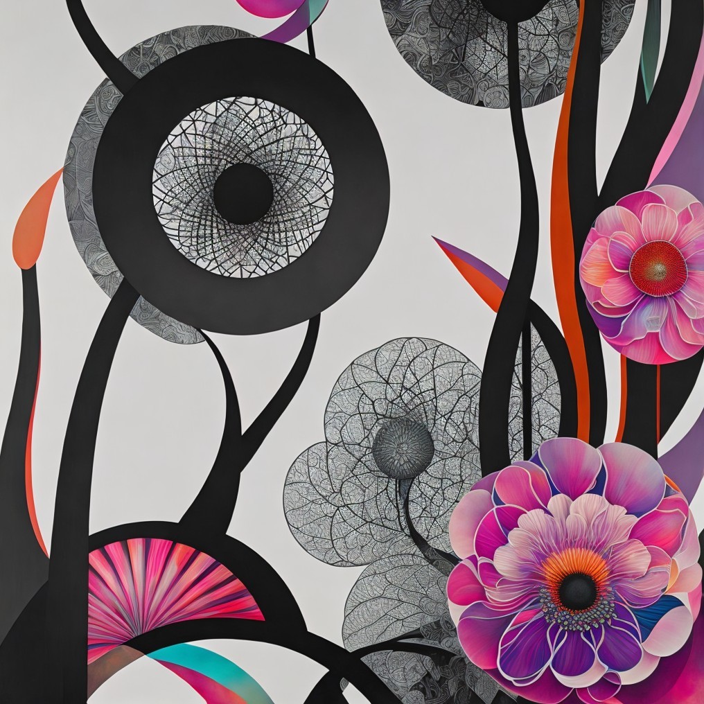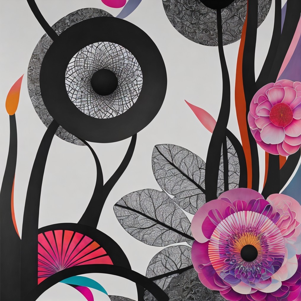 An abstract artwork with colorful floral patterns, geometric shapes, and swirls on a light background.