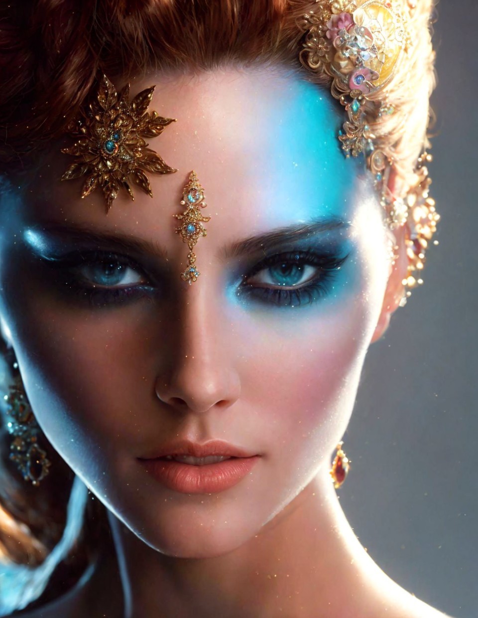 A woman with striking blue eyes, ornate golden hair accessories, and vibrant blue facial adornment.
