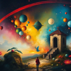 A surreal landscape featuring a vibrant sky filled with colorful planets and cosmic elements. A small chapel sits beside a path adorned with flowers, as two figures gaze in wonder.