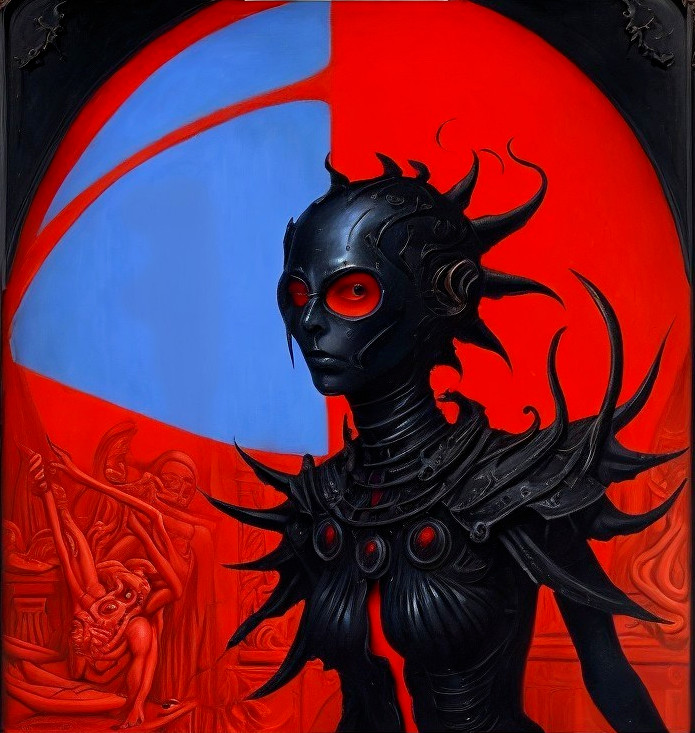 Mysterious Figure in Dark Armor with Vibrant Background