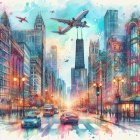 A vibrant city scene featuring tall skyscrapers under a colorful sky. An airplane soars above a bustling street with cars and pedestrians, capturing a lively urban atmosphere in watercolor.