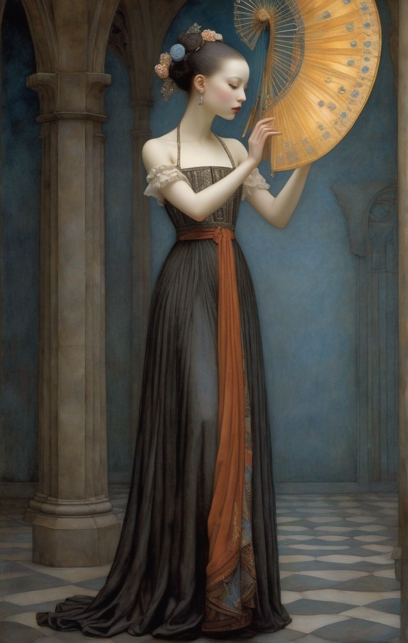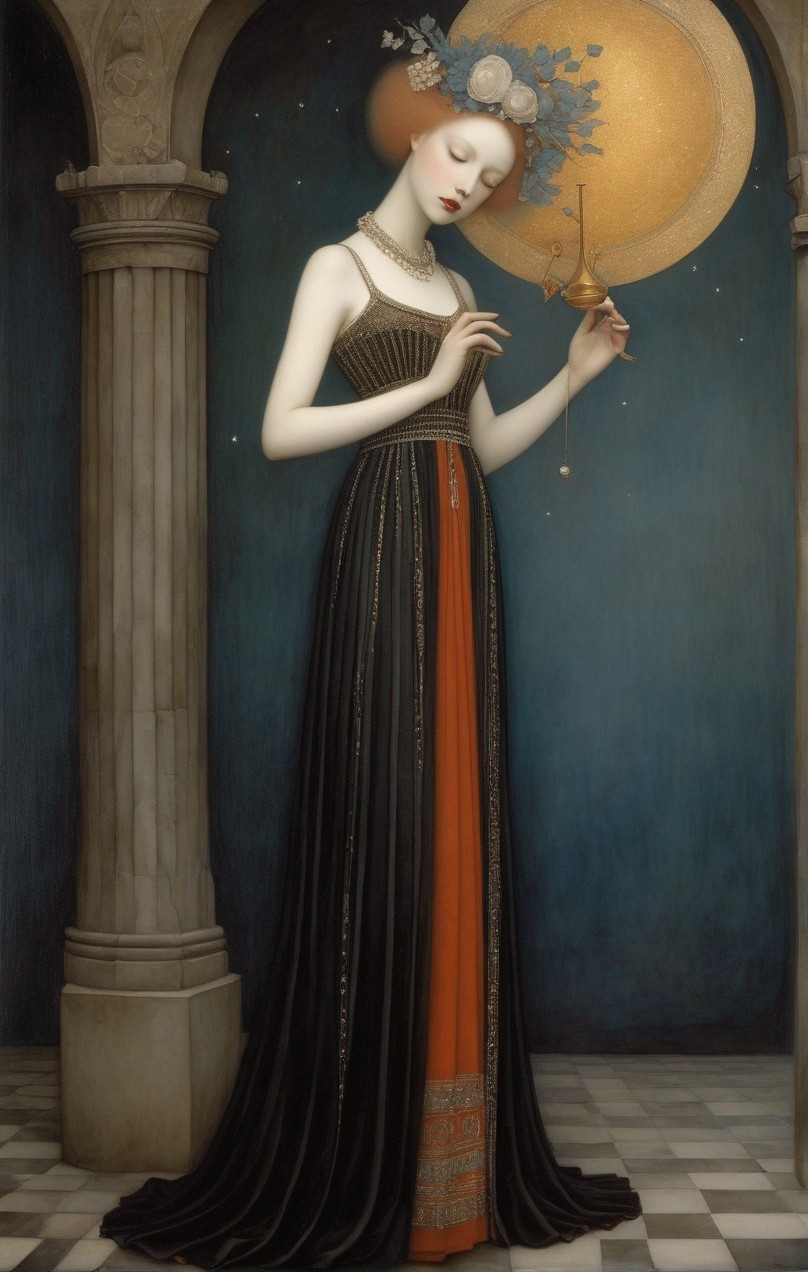 Ethereal woman in black and orange dress with golden sphere in mystical room