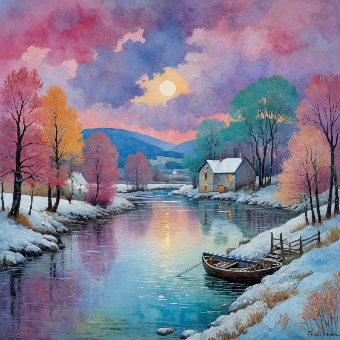 A serene winter landscape features a river reflecting a colorful sky at sunset. Leafless trees with vibrant hues border the water, while quaint houses sit along the banks and a boat awaits.