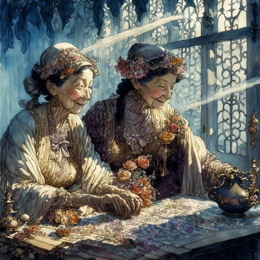 Two elderly women joyfully arrange colorful flowers by a sunlit window, surrounded by blooms and fruit. Their smiles reflect warmth and camaraderie in a charming, nostalgic setting.