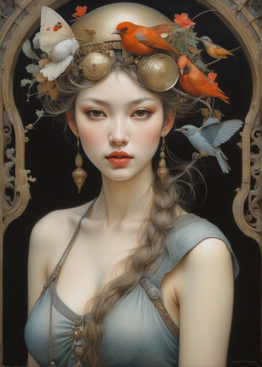 A painting of a woman with a serene expression, adorned with jewelry and surrounded by colorful birds against a gothic arched backdrop.