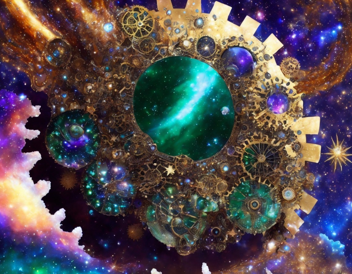 A vibrant cosmic scene with ornate celestial gears and clockwork, blending the mystical elements of space and time.