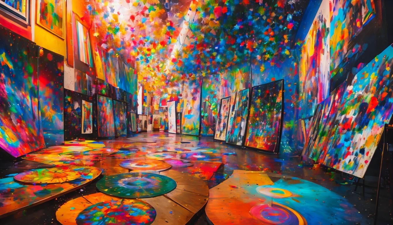 Vibrant Art Gallery with Colorful Paintings and Atmosphere