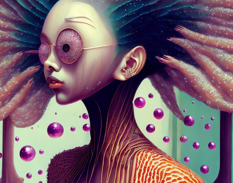 Fantastical artwork of female figure with surreal eye-like pattern, vibrant flora, and floating orbs.