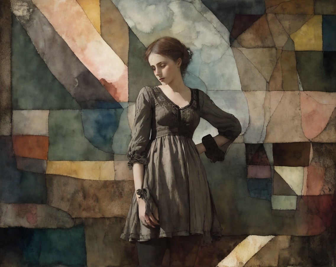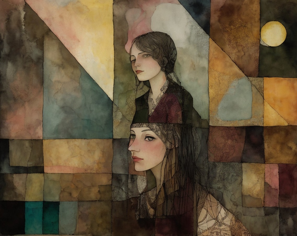 Patchwork fading tones of melancholy vintage summer nostalgia, soul search in portrait in ochre, patina of wine stains, mercury glass. Light and gossamer haze. art brut, moody, somber, desaturated colors, in the style of Paul Klee, Arthur Rackham, Banksy Stunning stylized, beautiful woman, intricate zentangle illustration, watercolor and ink painting, meticulous detail with fine pen strokes, intricate patterns, fractals, ochre and indigo colors, Amanda Clark, Catrin Welz-Stein, Zdzisław Beksiński, and Dee Nickerson