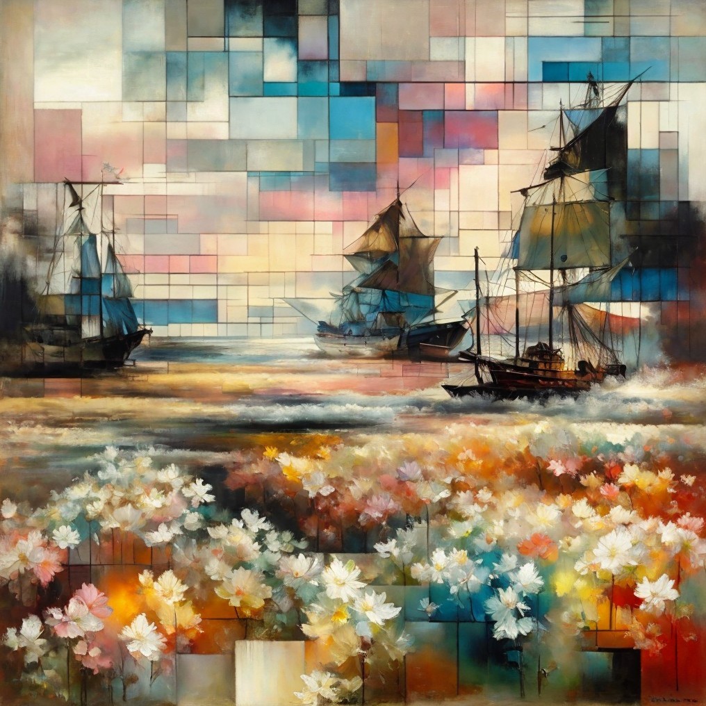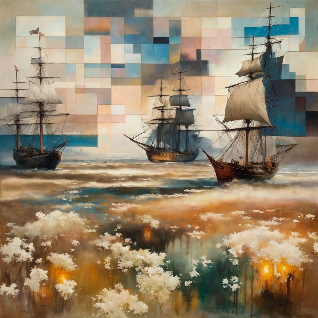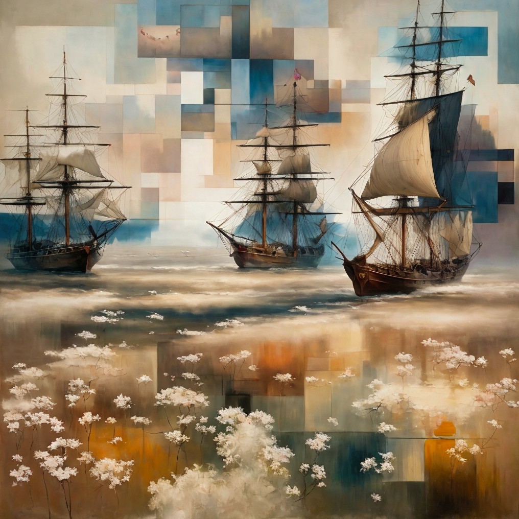 A serene maritime scene features three elegant ships with billowing sails, gliding across calm waters. Abstract geometric forms in soft earth tones create a tranquil, artistic backdrop.