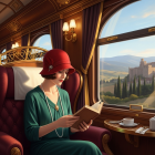 A woman in 1920s attire reads a book in a luxurious train compartment, with elegant decor and a scenic view of rolling hills and a castle through the window.