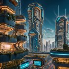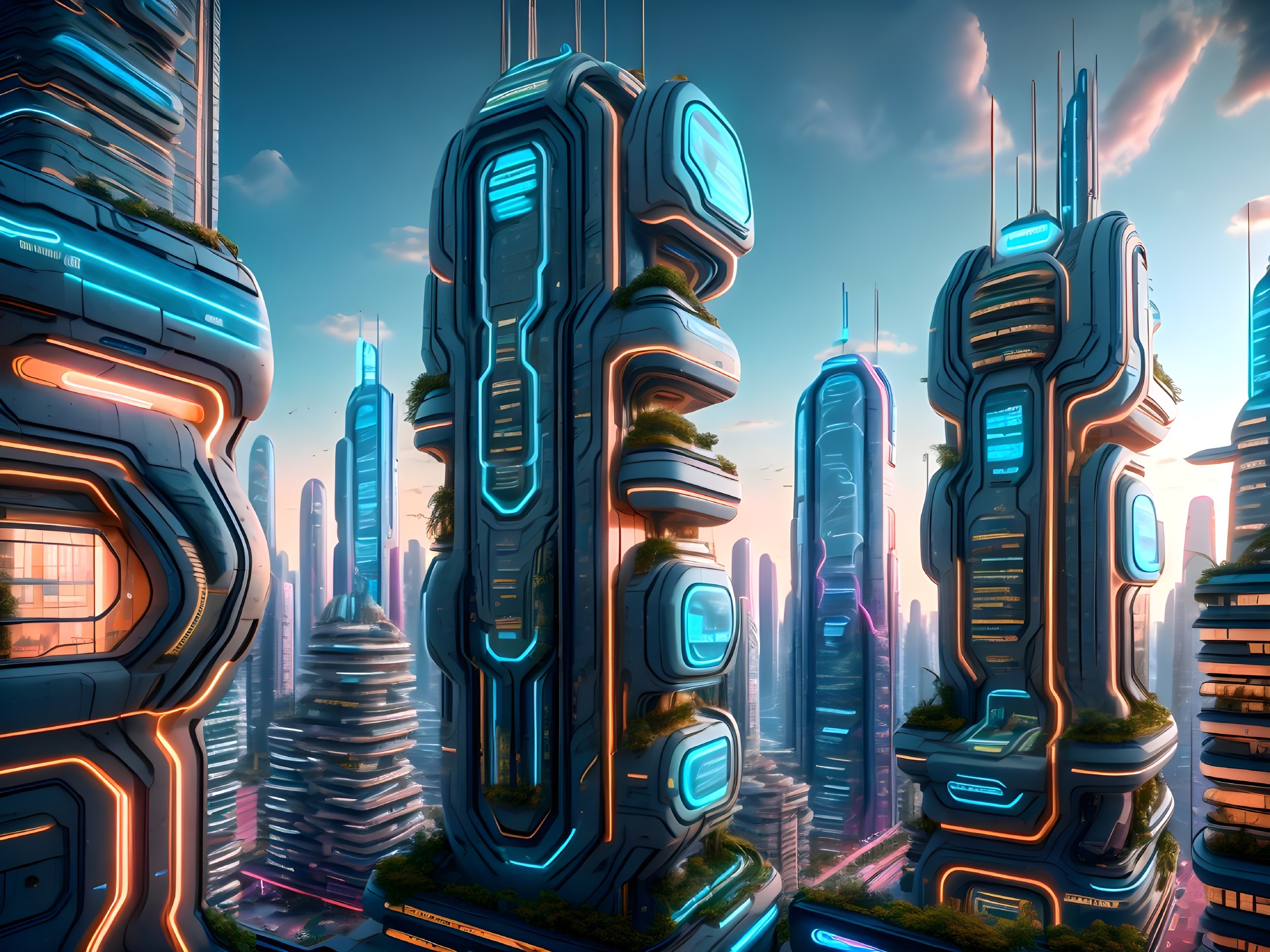 A futuristic cityscape features sleek, towering skyscrapers with flowing lines and vibrant lights. Elevated roadways weave through lush greenery, all under a colorful sunset sky.