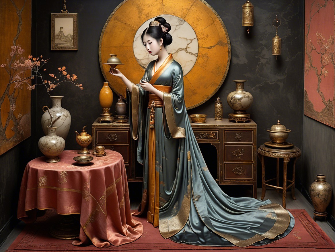 The girl in her boudoir, 3rd century Chinese miniature art, Velvet blush bronze, Shabby, Dull Gold, Amber Gray, marbled. dramatic